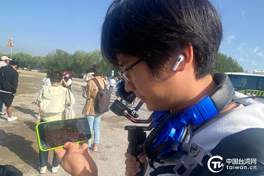 中國臺灣網記者李銳在采訪現場觀看紀念中國人民抗日戰爭暨世界反法西斯戰爭勝利80周年大會直播。(中國臺灣網記者 李寧 攝)