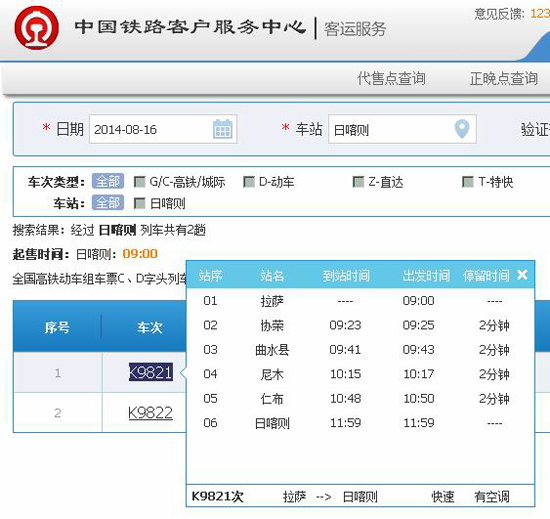 記者登錄“中國鐵路客戶服務中心”網站發現,在“車站車次查詢”功能中已經能夠完整地看到拉日鐵路K9821次旅客列車和K9822次旅客列車的運行時間、沿線各站?繒r間等信息,也可通過鐵路官網12306訂購票。