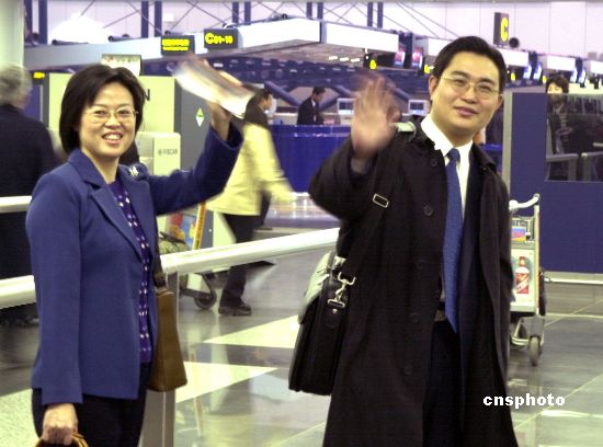 資料圖:大陸首批赴臺駐點采訪記者2001年2月8日離開北京,新華社記者范麗青和陳斌華清晨乘CA101航班飛經香港,當天抵達臺北,開始新世紀臺海兩岸倍受關注的新聞之行。 中新社發 賈國榮 攝