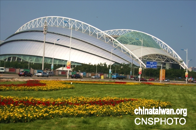 7月13日,2008奧運城市--沈陽分賽區奧林匹克中心裝飾一新,更加雄偉、漂亮。據悉,遼寧省沈陽市在整個沈陽奧林匹克公園新增了219萬平方米的綠化面積,種植了喬木15萬株、灌木140萬株,樹種有30余種,共擺放花卉70萬盆,總投資達3.14億元。