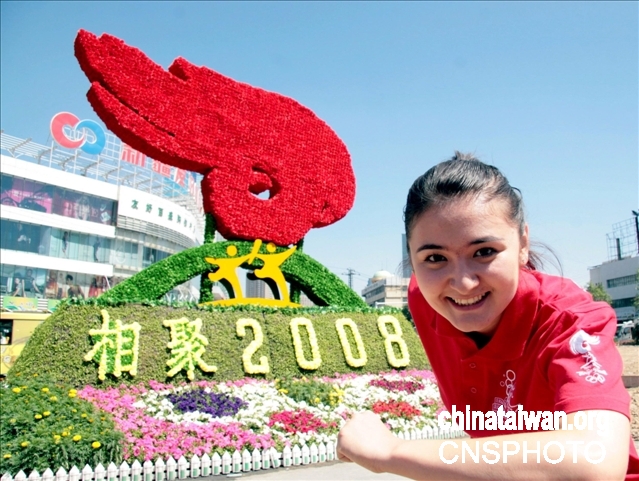 8月18日,烏魯木齊美麗的維吾爾族女孩拉拉·海力在一個奧運標志物前留影,表達對北京奧運健兒們的美好祝愿。北京奧運會如火如荼舉辦的時刻,新疆人民此時此刻以各種方式表達自己的心愿。 安正康 攝