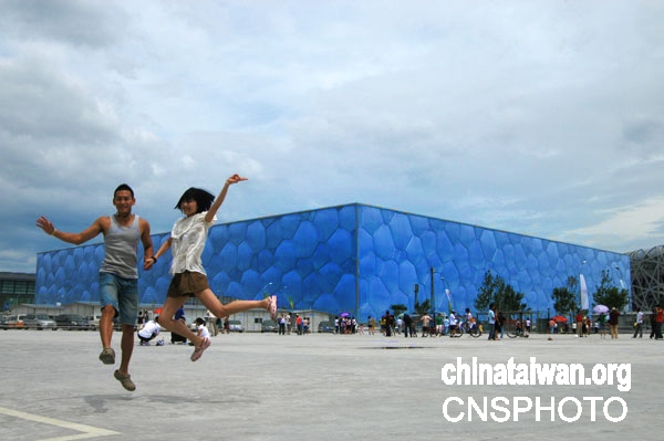 在水立方前廣場,一對年輕人以水立方為背景,一遍又一遍地歡呼雀躍,盡情釋放奧運激情,他們為自己留下了精彩的瞬間。也表達了對2008北京奧運會的期盼與祝福。 |