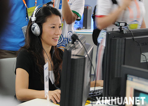 7月28日,奧運村網吧開通。圖為奧運冠軍楊揚接受新華社記者王妍專訪。