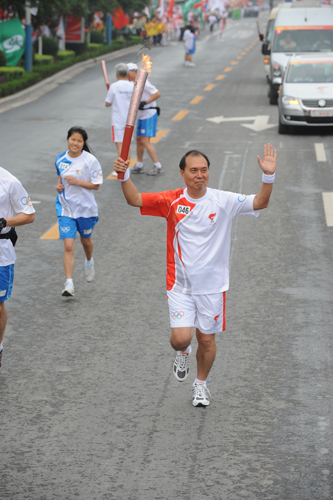 7月23日上午,奧運火炬開始了在泉城濟南的傳遞。圖為第46棒火炬手臺商王克璋。(濟南市臺辦供圖)