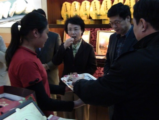 北京市副市長陳紅正在品嘗銷售人員準備的百年老字號的鳳梨酥。