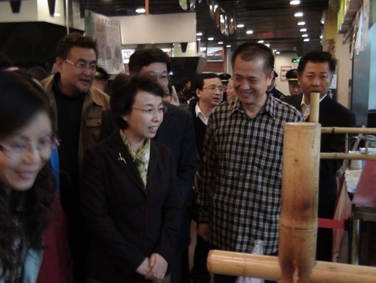 臺灣百大館工作人員正在認真的給北京市副市長陳紅介紹本館的相關情況,北京副市長陳紅耐心的聆聽。