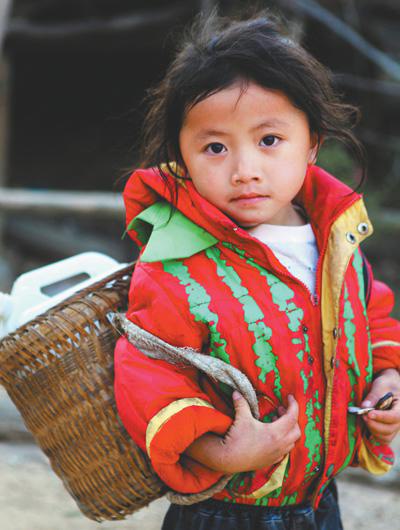廣西百色市西林縣送水時,一名5歲的苗族小女孩羅云也背著水壺準備接送水車送來的水。人民網記者 龐革平 謝建偉攝影報道