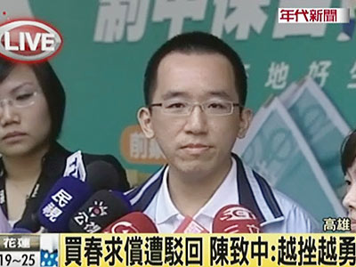 曾放出“如果有召妓就退選”豪言的陳致中,控告臺灣《壹周刊》回復名譽并求償新臺幣200萬元案,高雄地方法院今天上午宣判,法官調閱陳致中使用手機和序號等數據查證,認定陳致中就是召妓男,全案駁回,判決《壹周刊》不用賠償。陳致中聽到判決結果大表不服,直指法院判決草率,要大家用選票來討回公道。妻子黃睿靚更泣訴說,絕對百分百相信老公不會召妓或有疑似召妓的行為。