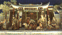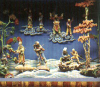 嘉義是臺灣交趾陶的發源地,因而有“交趾陶的故鄉”之稱,日人又稱之為“嘉義燒”。交趾陶為一種低溫多彩釉,是融合了軟陶與廣窯的一種陶藝,且包容了捏塑、繪畫、燒陶等技藝及宗教文化的民俗工藝,堪稱民間藝術的國寶。 據考證,交趾陶發源于兩廣福建一帶,清時隨移民傳入臺灣。臺灣的交趾陶主要作為廟宇或傳統建筑中的裝飾,多飾于廟宇建筑的屋頂、墻壁上的水車堵、身堵、墀頭,而題材多半以教化人心的忠孝節義及吉祥獻瑞等為主,其人物的身段、服飾則深受地方戲曲及歌仔戲的影響,不論人物或鳥獸、花卉的造型、用色,皆十分鮮艷生動而活潑,其特色在于晶亮艷麗的寶石釉彩,呈現多元豐富的民俗風格。 而在傳入臺灣的150年間,由于交趾陶的制作技巧難度高,因此習得此藝的匠師寥寥可數,其中以尊為“葉王”的葉麟趾,為臺灣交趾陶的開山宗師。其作品還曾在世界博覽會中引起藝壇的震驚,被譽為臺灣絕技,后世尊為“臺灣交趾陶之父”,其作品散見于嘉南一帶各大廟宇,如今僅剩臺南學甲“慈濟宮”、佳里“震興宮”及嘉義“城隍廟”等地保留較完整;其作品造型豐富、沉逸古拙,尤以人物栩栩如生,用色沉斂穩健,并獨創胭脂紅、翠綠顏色的釉料,后世更有“葉王交趾燒”之封譽。 同樣是寺廟裝飾要角的剪粘,主要飾于廟頂,常與交趾陶互為搭配。 近年來,本土意識覺醒,臺灣民俗傳統工藝日漸復興,交趾陶藝術再度受到重視,這項失落的民間工藝獲得重生。