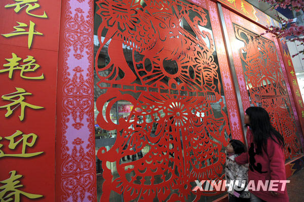 2月1日,兩個孩子在合肥市步行街觀看商場櫥窗上粘貼的巨大窗花。