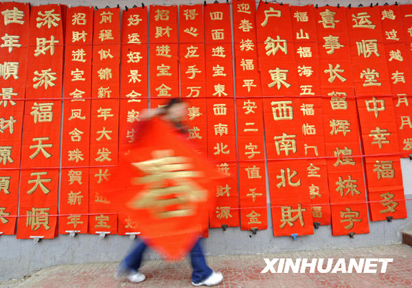 2月1日,在湖北省宜昌市街頭,一名市民從掛滿春聯的墻邊走過。新華社發(曹禮達 攝)