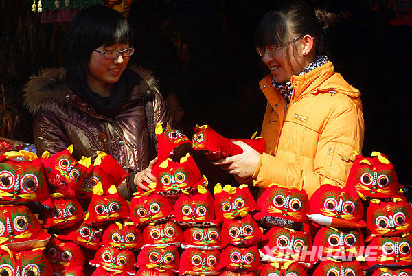 1月4日,兩名游客正在杭州清河坊古街挑選虎頭鞋。