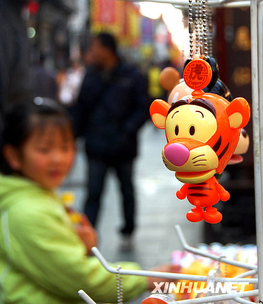 杭州清河坊古街上出售的“虎娃”玩具(1月4日攝)。新年伊始,農歷虎年的氣氛逐漸濃郁,杭州清河坊古街上出售的各式“虎元素”商品成為市民、游客挑選購買的熱門。新華社發(陳小向 攝)