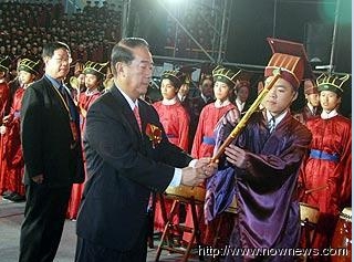 中國臺灣網9月27日消息 據臺灣“今日新聞”報道,2009年第二屆中華文化快車兩岸師生聯合祭孔大典今天上午在新竹縣立體育館隆重登場,祭孔大典更開創先例,通過網絡視頻同步同時在新竹、北京、山東三地聯合進行,萬余名兩岸師生共同參與。親民黨主席宋楚瑜更第二度應邀擔任祭孔大典主禮正獻人,這也是近60年以來,臺灣民間祭孔規模最大的一次集會。